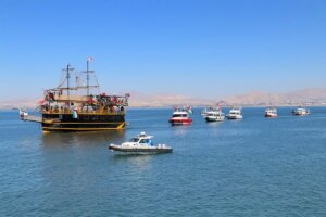 Van Gölü’nde Gazze’ye destek için tekne ve kanolarla gösteri yapıldı, İsrail zulmü protesto edildi.