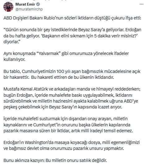Emir, sosyal medya hesabından yaptığı açıklamada, Rubio’nun “Günün sonunda bir şey istediklerinde Beyaz Saray’a geliyorlar. Erdoğan da bu hafta geliyor. ‘Başkanın elini sıkmam için 5 dakika verir misiniz?’ diyorlar” sözlerine dikkat çekerek, aynı konuşmada “yalvarmak” gibi ifadeler kullanıldığını ifade etti.