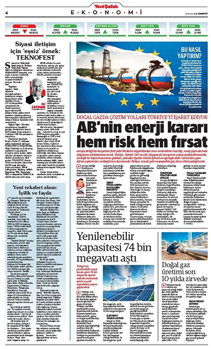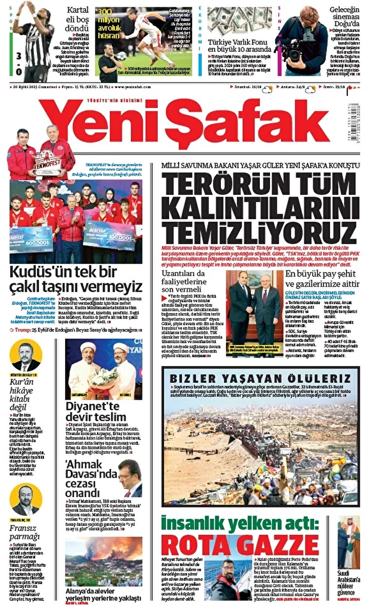 Yeni Şafak Gazetesi’nin 20 Eylül 2025 tarihli birinci sayfasında yer alan manşet ve haberler…
